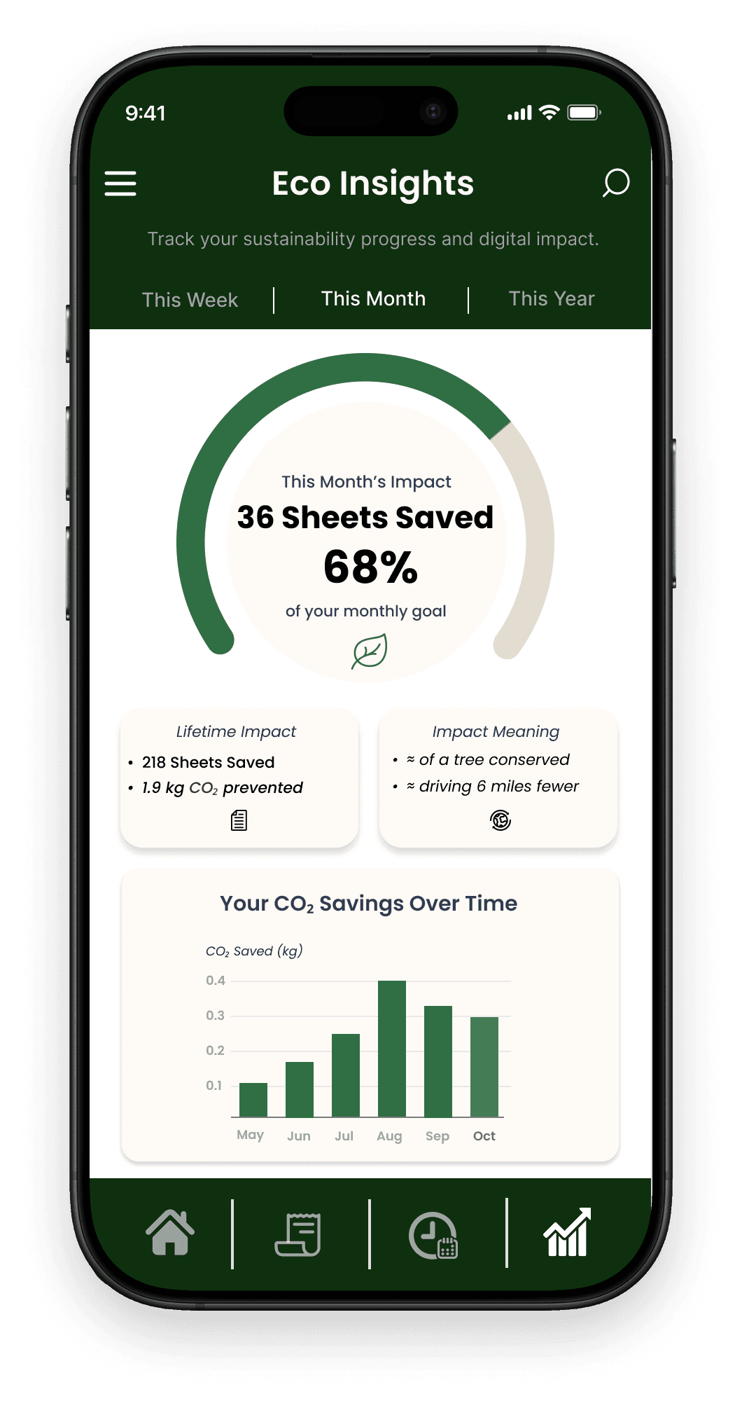 Gaia translates digital receipt adoption into measurable indicators such as paper saved and CO2 prevented. Sustainability becomes a passive outcome of better system design.